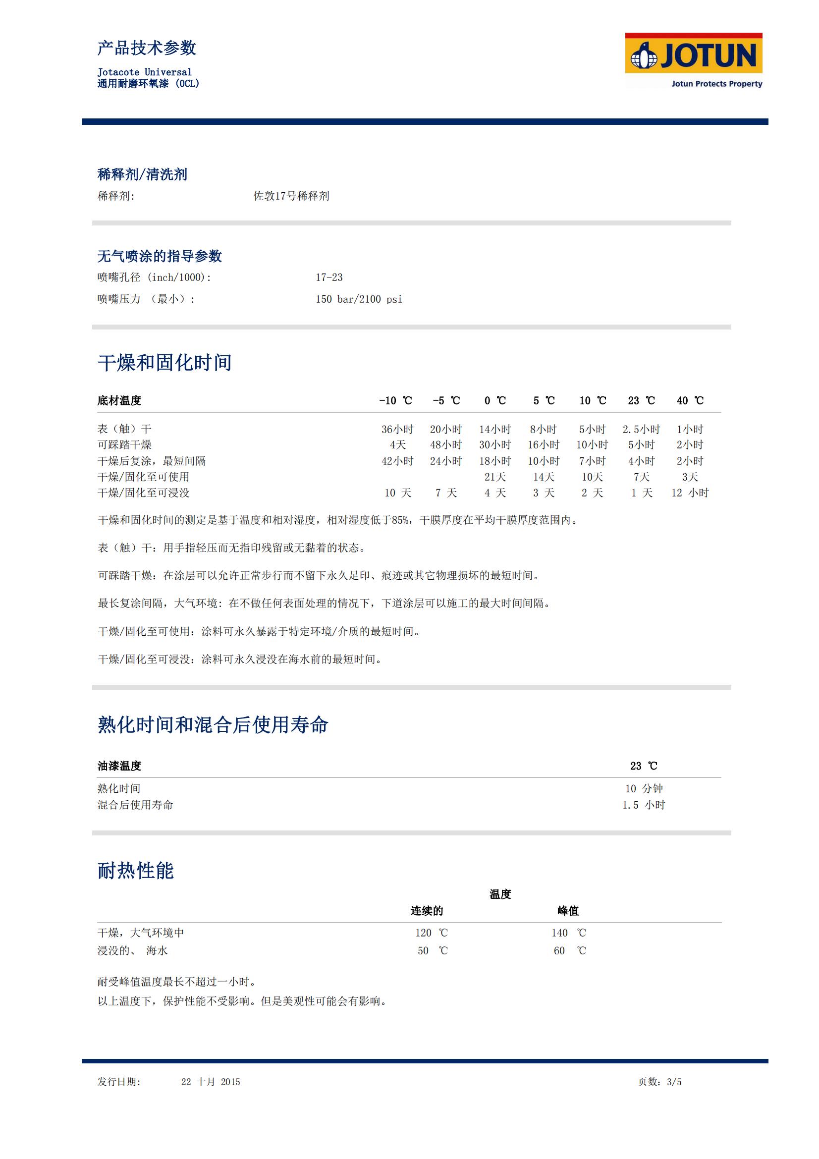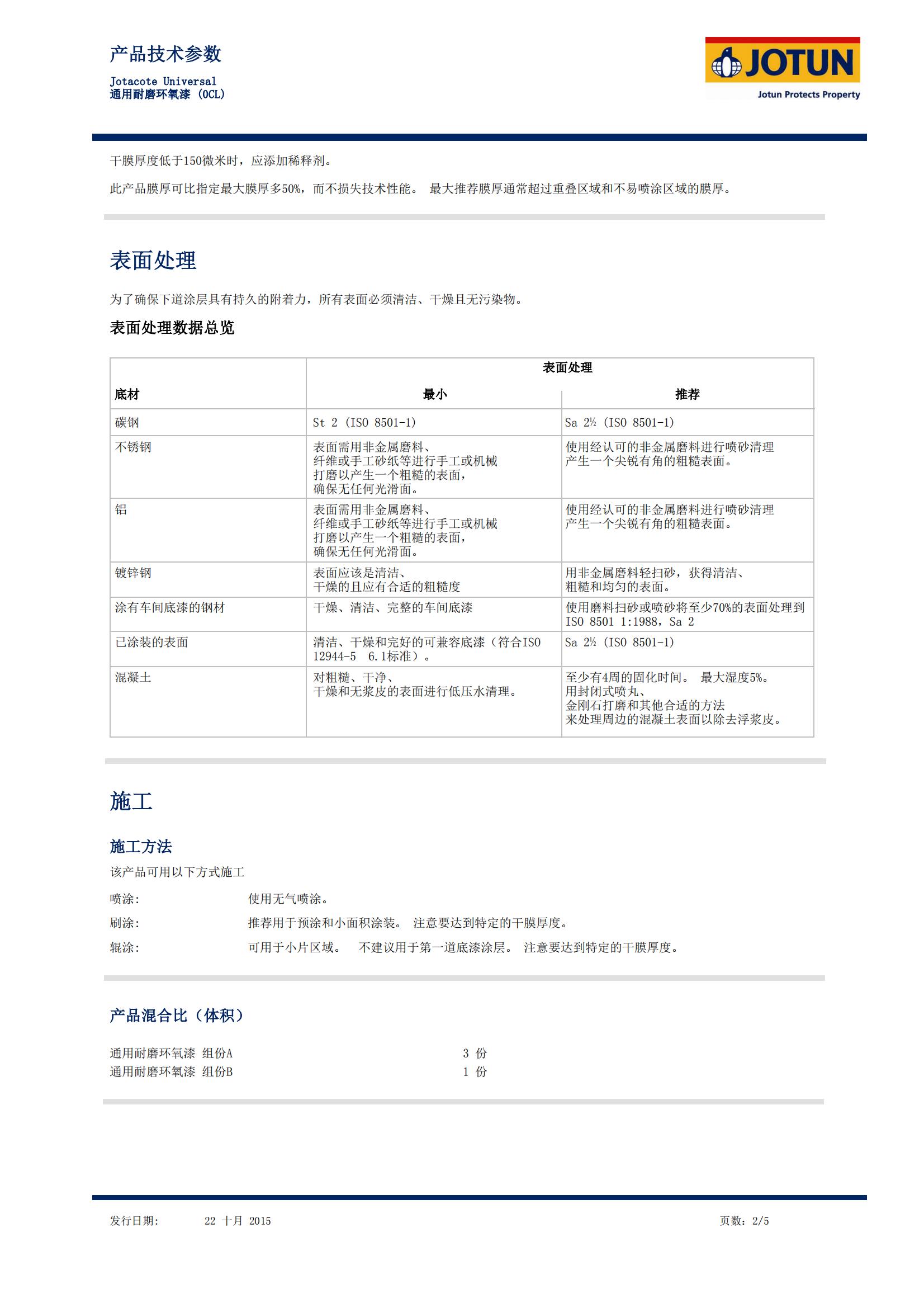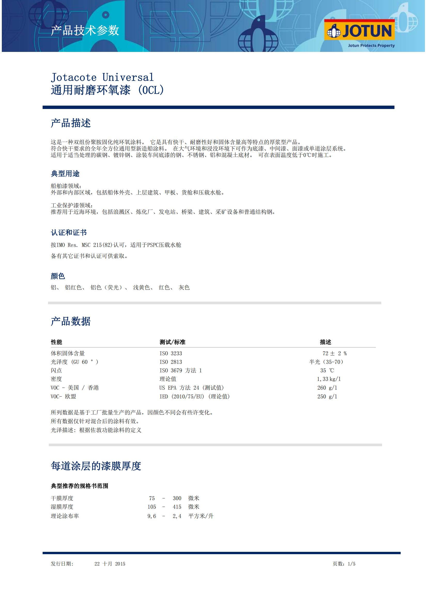 • Jotacote Universal 0CL:這是一種雙組份聚胺固化純環(huán)氧涂料。 它是具有快干、耐磨性好和固體含量高等特點(diǎn)的厚漿型產(chǎn)品。符合快干要求的全年全方位通用型新造船涂料。 在大氣環(huán)境和浸沒(méi)環(huán)境下可作為底漆、中間漆、面漆或單道涂層系統(tǒng)。適用于適當(dāng)處理的碳鋼、鍍鋅鋼、涂裝車(chē)間底漆的鋼、不銹鋼、鋁和混凝土底材。 可在表面溫度低于0°C時(shí)施工,典型用途船舶漆領(lǐng)域:外部和內(nèi)部區(qū)域,包括船體外殼、上層建筑、甲板、貨艙和壓載水艙。工業(yè)保護(hù)漆領(lǐng)域:推薦用于近海環(huán)境,包括浪濺區(qū)、煉化廠、發(fā)電站、橋梁、建筑、采礦設(shè)備和普通結(jié)構(gòu)鋼